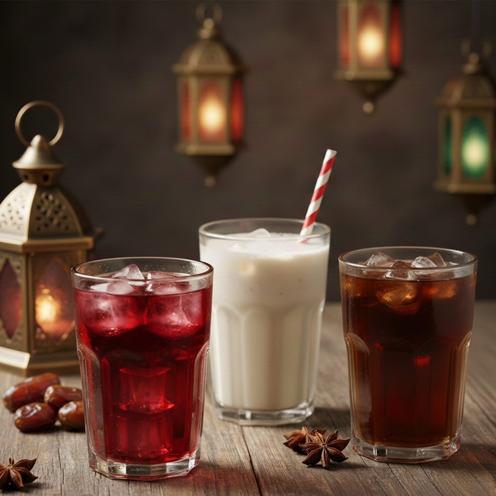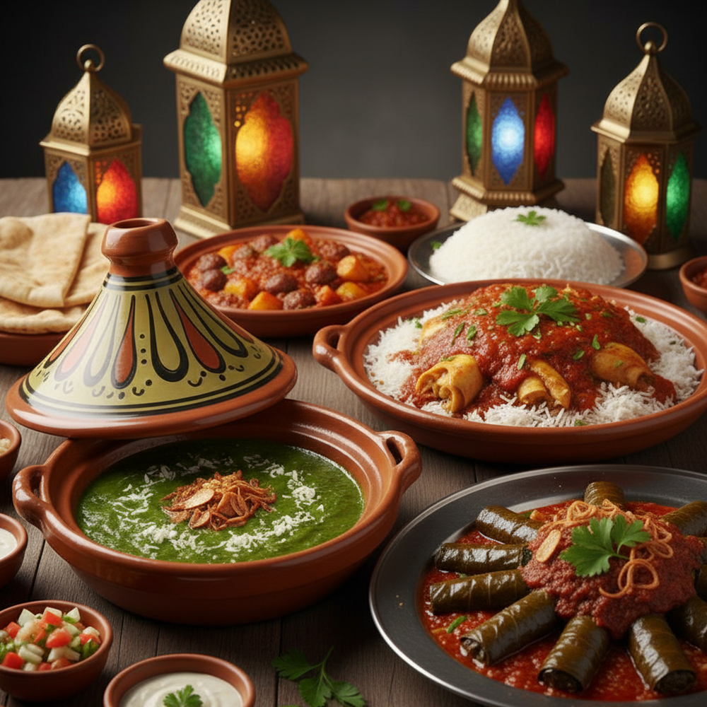 Ramadan drink of your choice: (Hibiscus / Tamarind / Sobya). One soup of your choice: (Orzo soup / Creamy chicken soup / Lentil soup / Vegetable soup). Two types of salad of your choice: (Baladi salad / Tahini salad / Baba Ganoush / Yogurt salad / Beet salad / Mixed pickles / Pickled eggplant / Fattoush). Appetizers: (Stuffed grape leaves, Mombar, Mixed samosas). Main dish: Molokhia tagine + Fatta tagine of your choice (Banana Fatta / Cow trotters Fatta / Meat Fatta). Sausage tagine with potatoes + Grape leaves with cow trotters. Rice with vermicelli or white rice. Additions: Baladi bread, Oriental sweets, Mineral water.