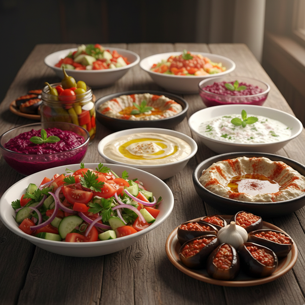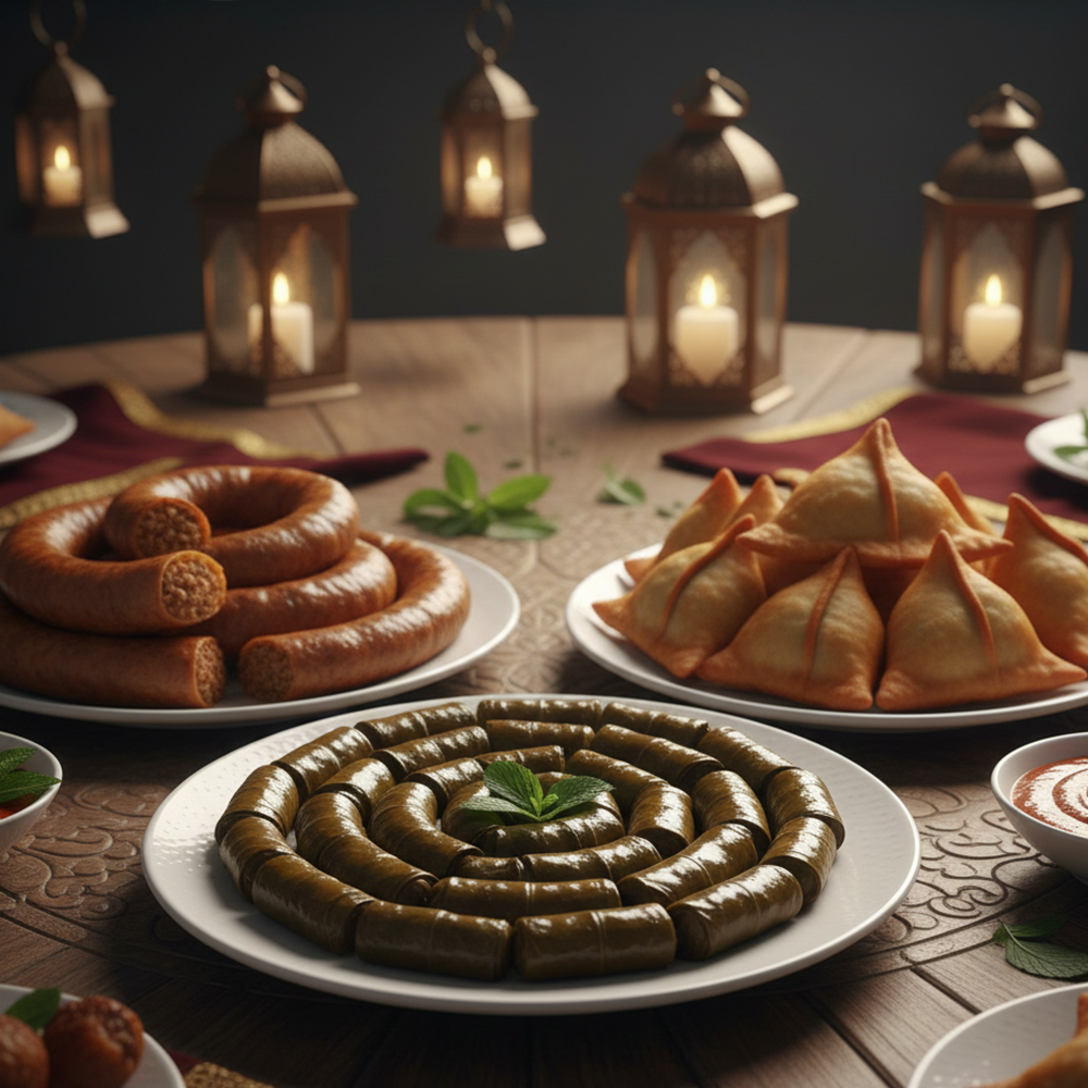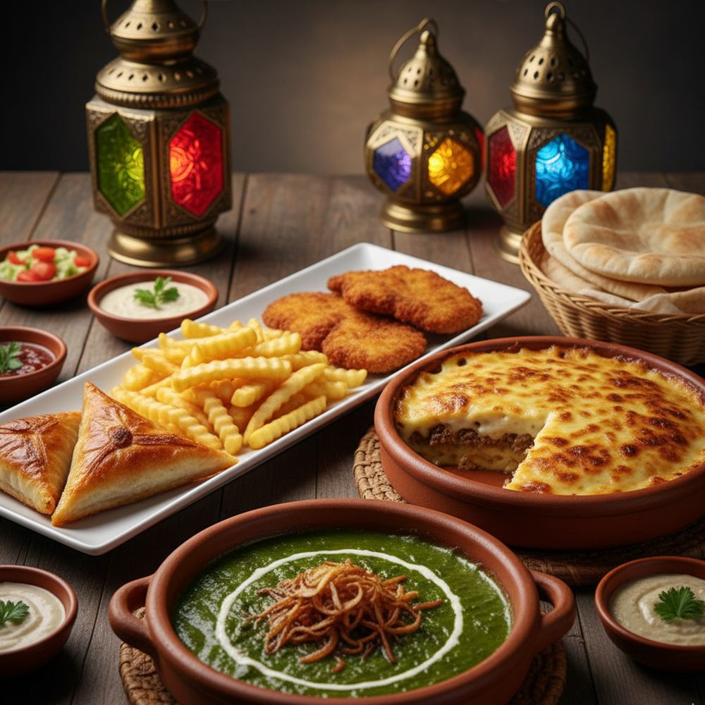 <p>Ramadan drink of your choice: (Hibiscus / Tamarind / Sobya). <br><br>2 soups of your choice: (Vermicelli soup / Chicken cream soup / Lentil soup / Vegetable soup). <br><br>2 types of salad of your choice: (Baladi salad / Tahini salad / Baba ghanoush salad / Yogurt salad / Beetroot salad / Mixed pickles / Pickled eggplant / Fattoush). <br><br>Appetizers: (Grape leaves, Mombar, Mixed samosas). <br><br>Main course: <br><br>Molokhia casserole + Béchamel pasta casserole. <br><br>3 pieces of breaded chicken + a plate of fries. <br><br>3 pieces of meat-filled pastry (Goulash). <br><br>Additions: Baladi bread, oriental sweets, mineral water.</p>