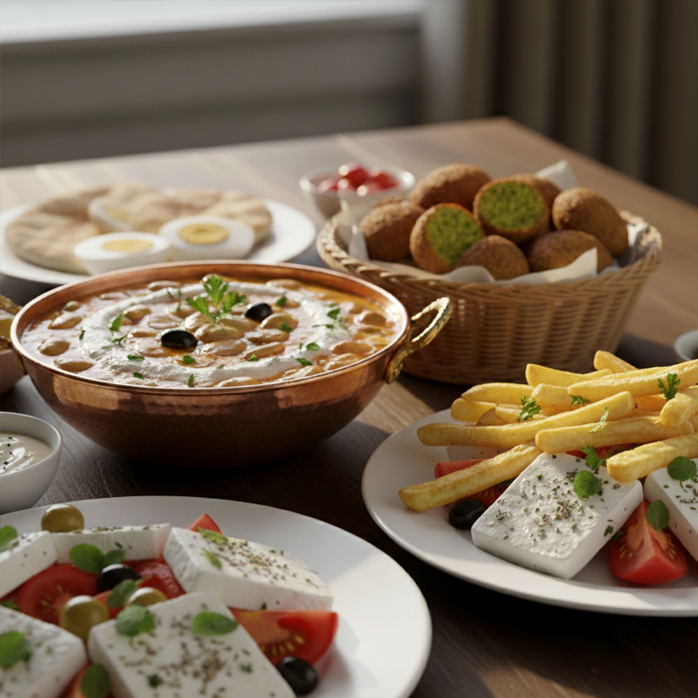 <p>Fava beans of your choice: (olive oil / spicy oil / sweet oil / with ghee).<br><br>Falafel: Sesame falafel.<br><br>Eggs: Boiled or omelette.<br><br>Other items: Cheese with tomatoes, fried potatoes, salad, yogurt.<br><br>Bread and drinks: Basket of bread (3 loaves), mineral water.</p>