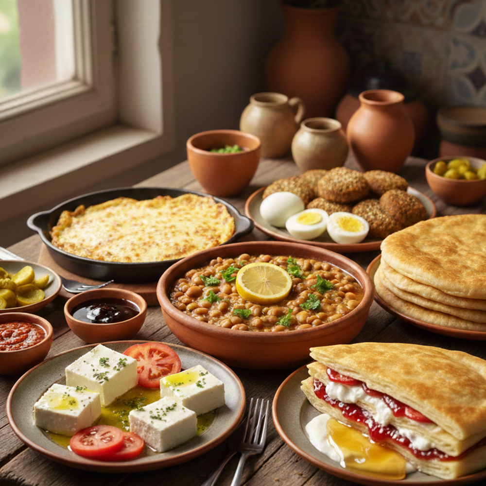 <p>Fava beans of your choice: (olive oil / spicy oil / sweet oil / with ghee / with sausage).<br><br>Eggs: boiled or omelet.<br><br>Other items: cheese with tomatoes, cheese with potatoes, a cheese skillet of your choice, layered pastry, Skalanas Layali Zaid, black or white honey, yogurt.<br><br>Drinks: mineral water.</p>